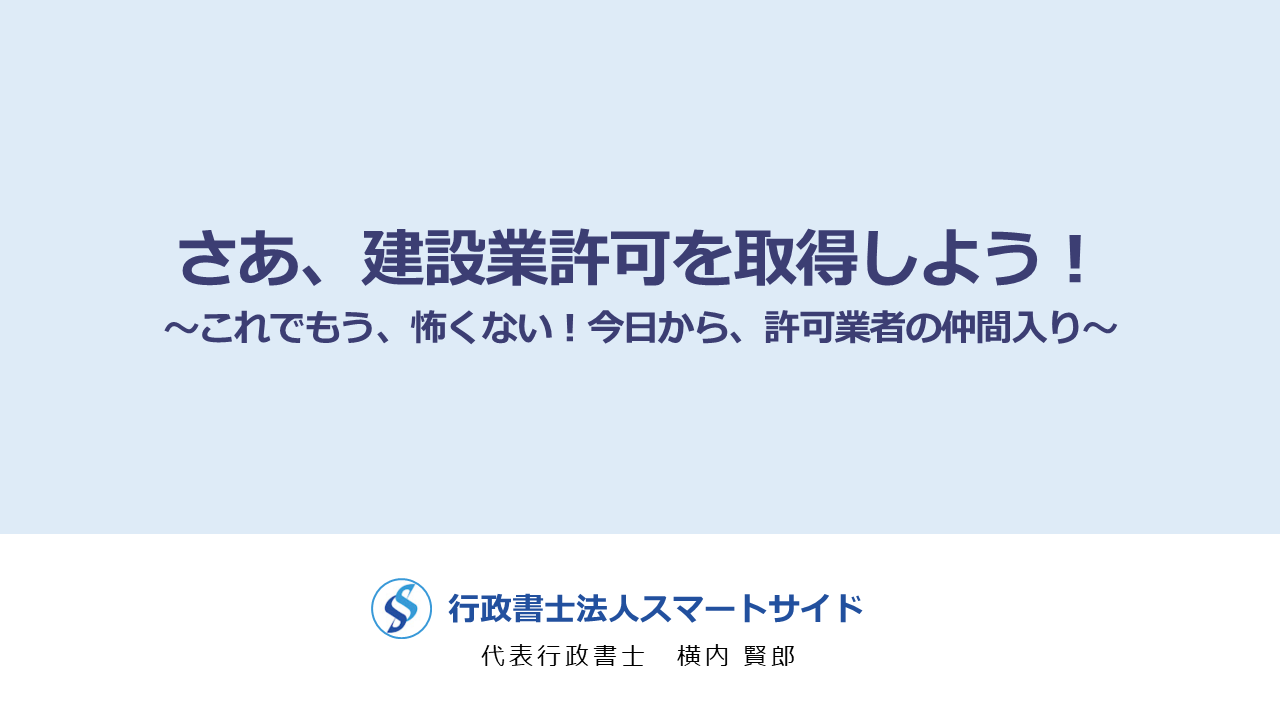 そんな、複雑で難解な手続きを安心して任せられる存在になりたいというのが、行政書士法人スマートサイドの願いです。「民間工事だけでなく、公共工事を売上のもう一本の柱とすることによって、会社の経営を安定させ、さらに事業を発展させたい…」というみなさんの願いを一日でも早く実現し、後押しをしていきたいと思っています。